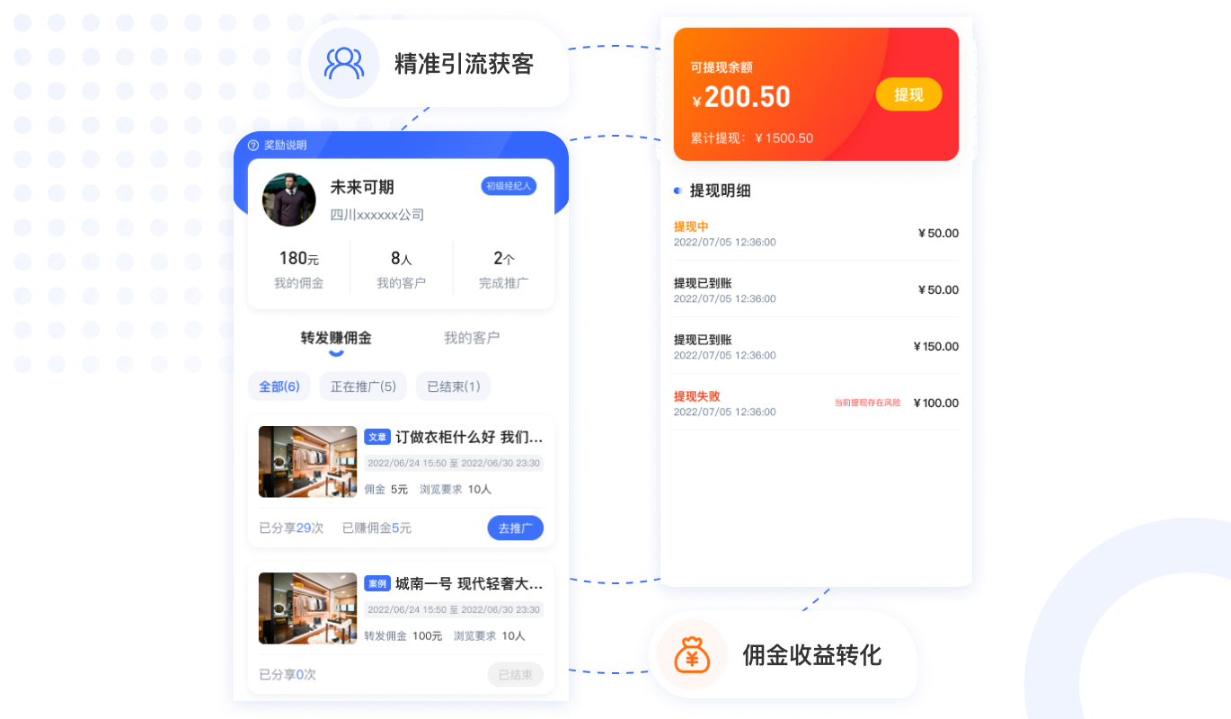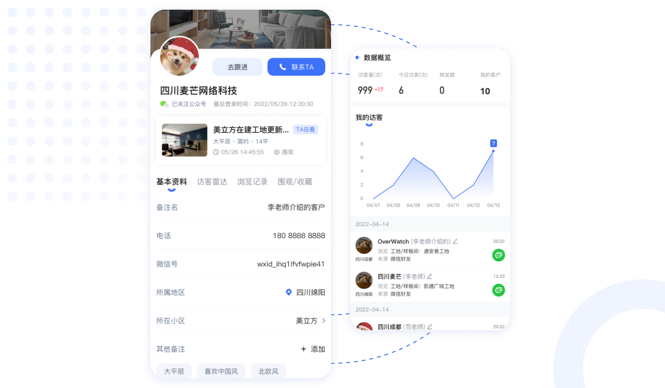 精準(zhǔn)引流,客戶軌跡追蹤推送、深度洞察客戶需求。 快速鎖客,直接對(duì)話消息及時(shí)提醒,增加量房量為銷(xiāo)售賦能。