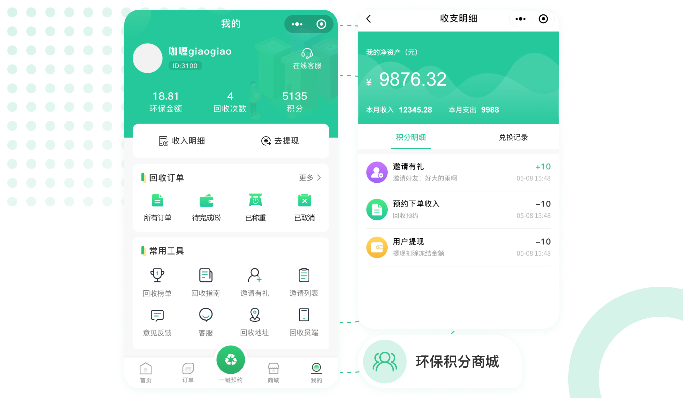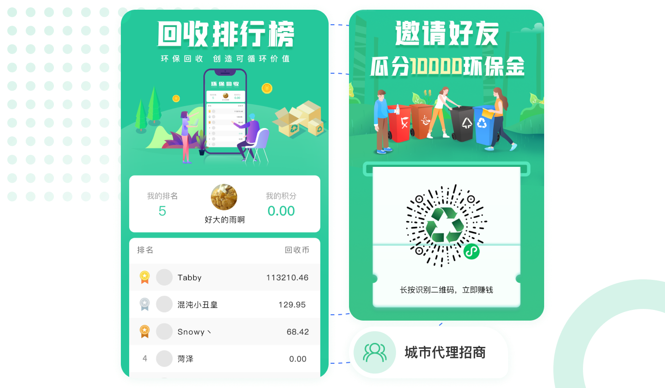 用戶出售垃圾廢品換錢(qián)的同時(shí)享受積分,積分可以?xún)稉Q商品,增加用戶的使用黏性。