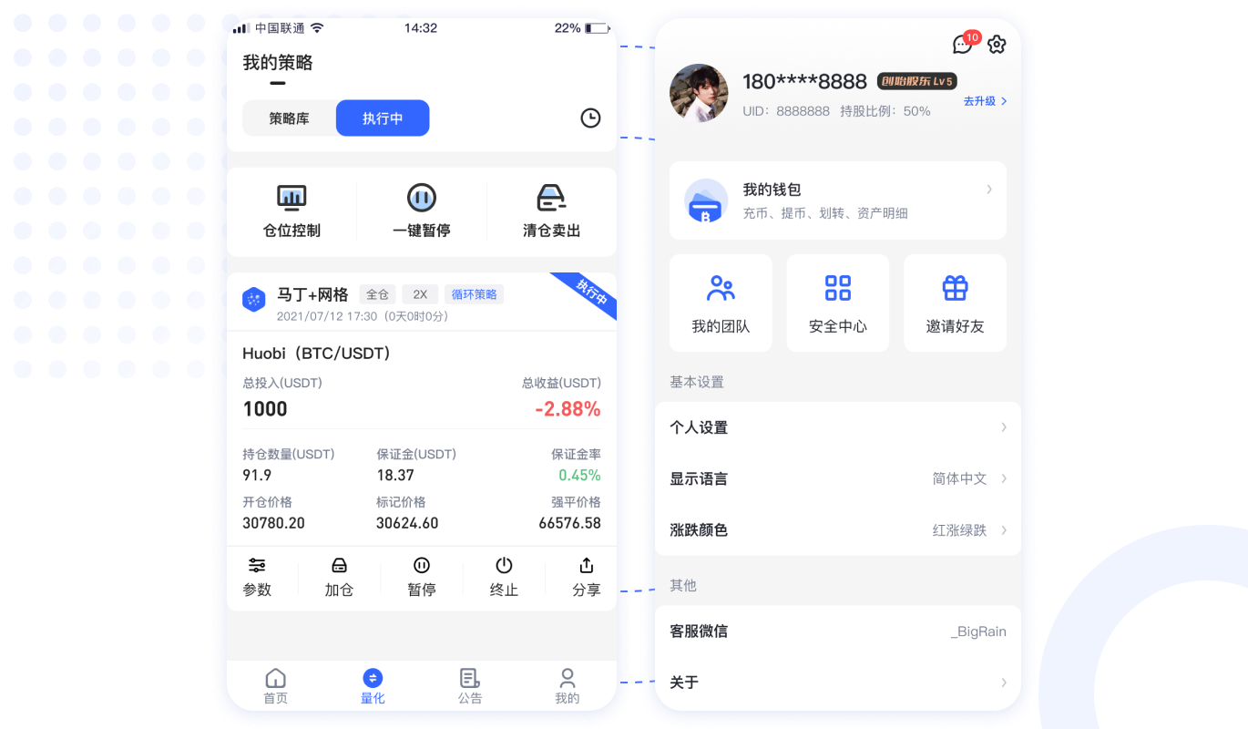 馬丁倍投+網(wǎng)格混合策略、趨勢(shì)補(bǔ)倉(cāng)、尾單補(bǔ)倉(cāng)、風(fēng)險(xiǎn)控制、防瀑布機(jī)制、螺旋式補(bǔ)倉(cāng)、一鍵補(bǔ)倉(cāng),首單加倍。